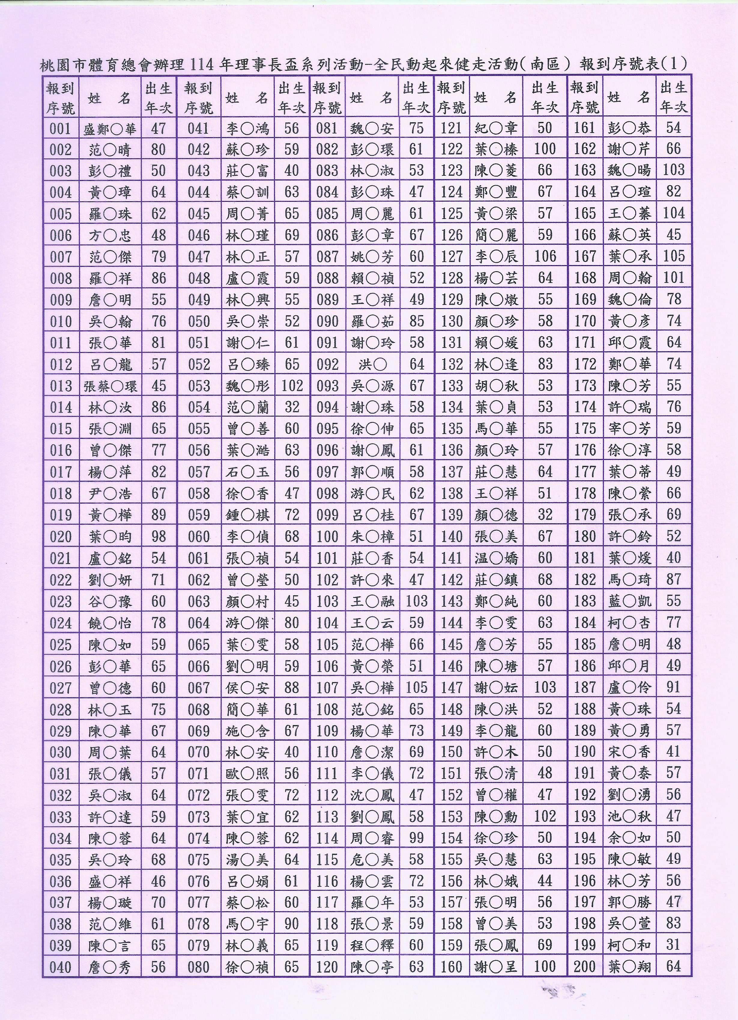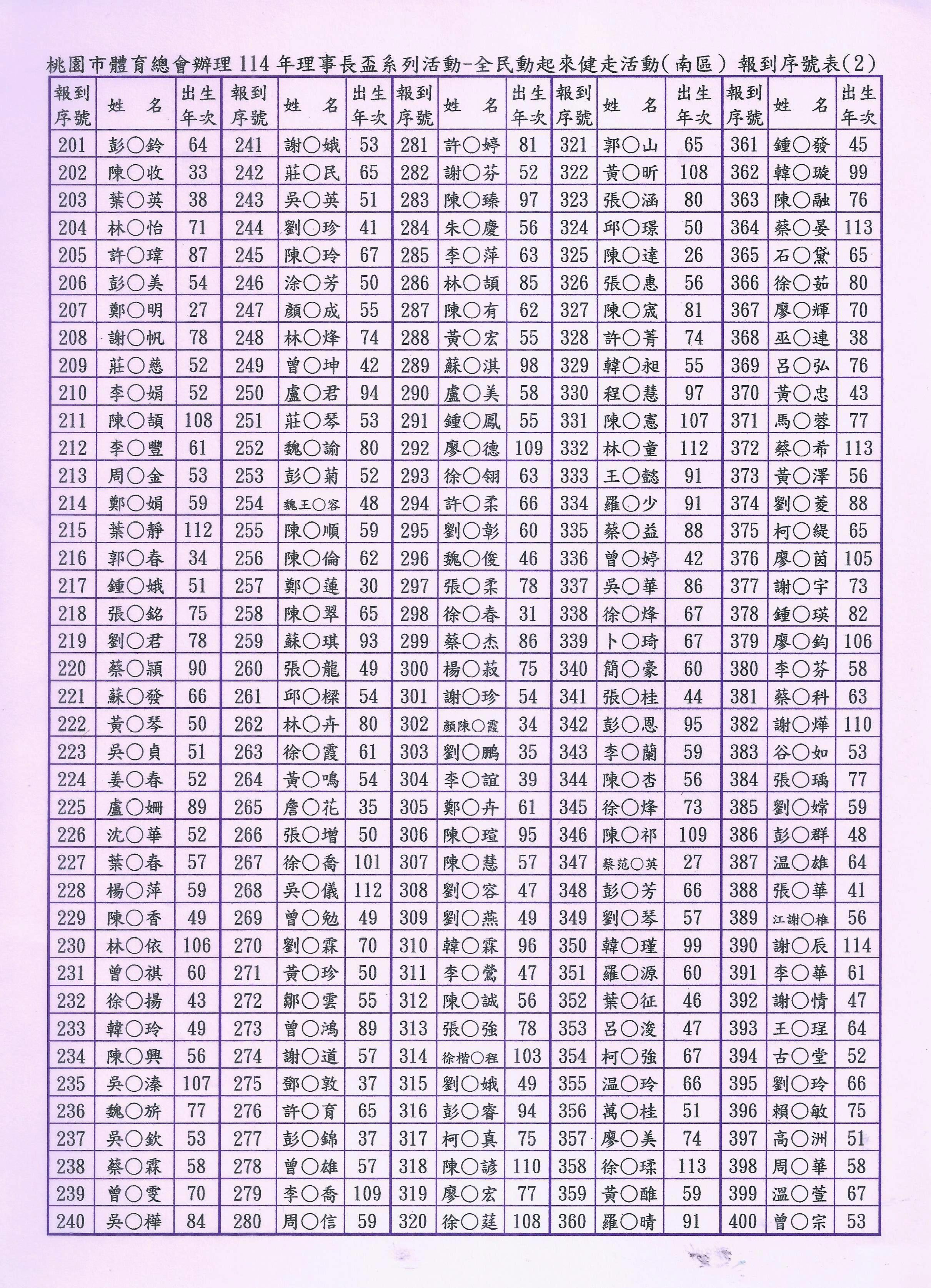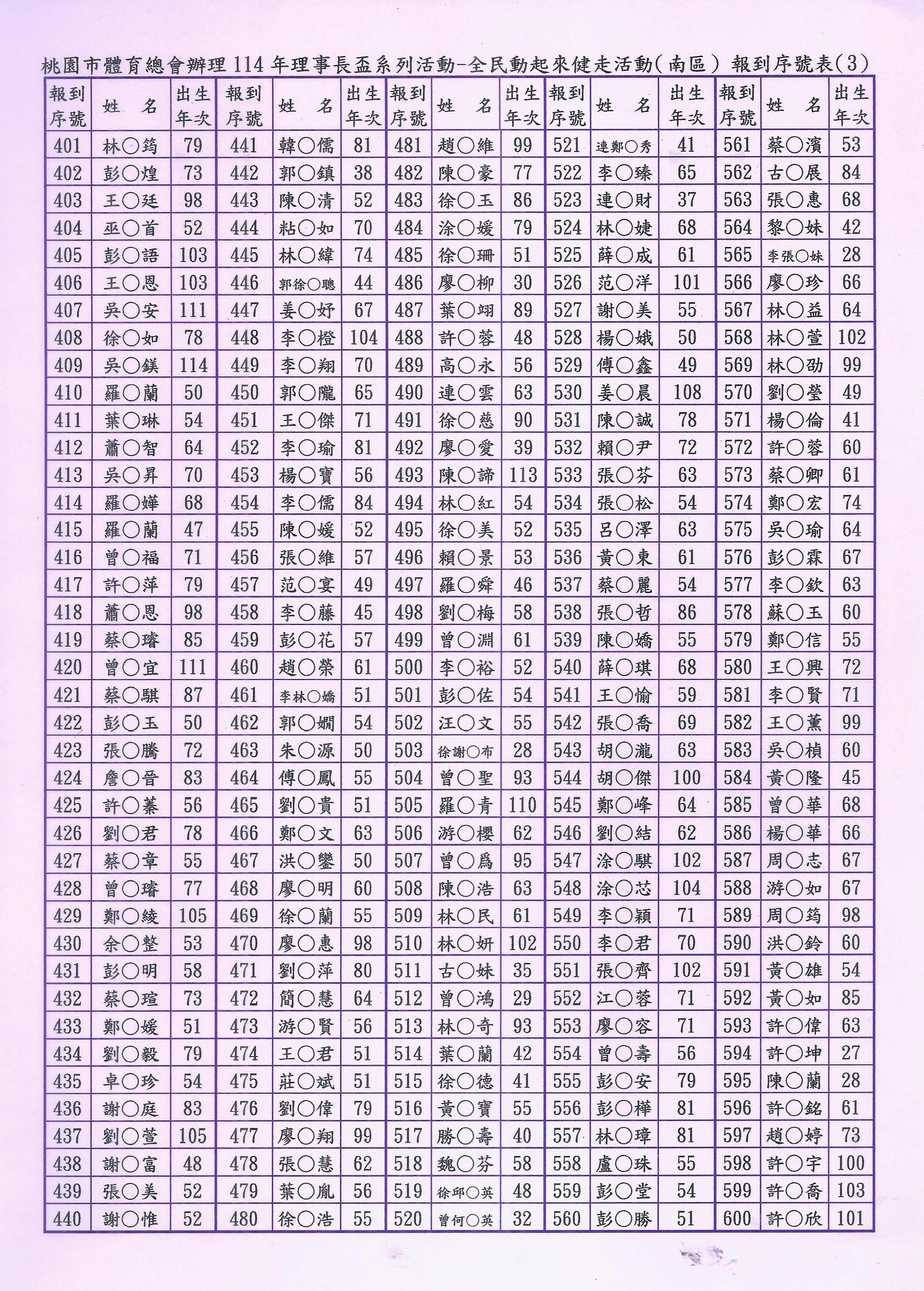 3.完成線上報名者請於活動當日07:40~08:20親自攜帶相關身分證件(例:身分證、健保卡、駕照等之一種有效證明文件備查)至線上報名報到窗口辦理報到。(為簡便快速完成活動當日的報到手續,本會將已報名者依先後順序編定「報到序號」,請參閱附加檔案,並請您記住三位數之「報到序號」,在報到時告訴我們您的「報到序號」。報到序號,並公告於桃園市體育總會官網。