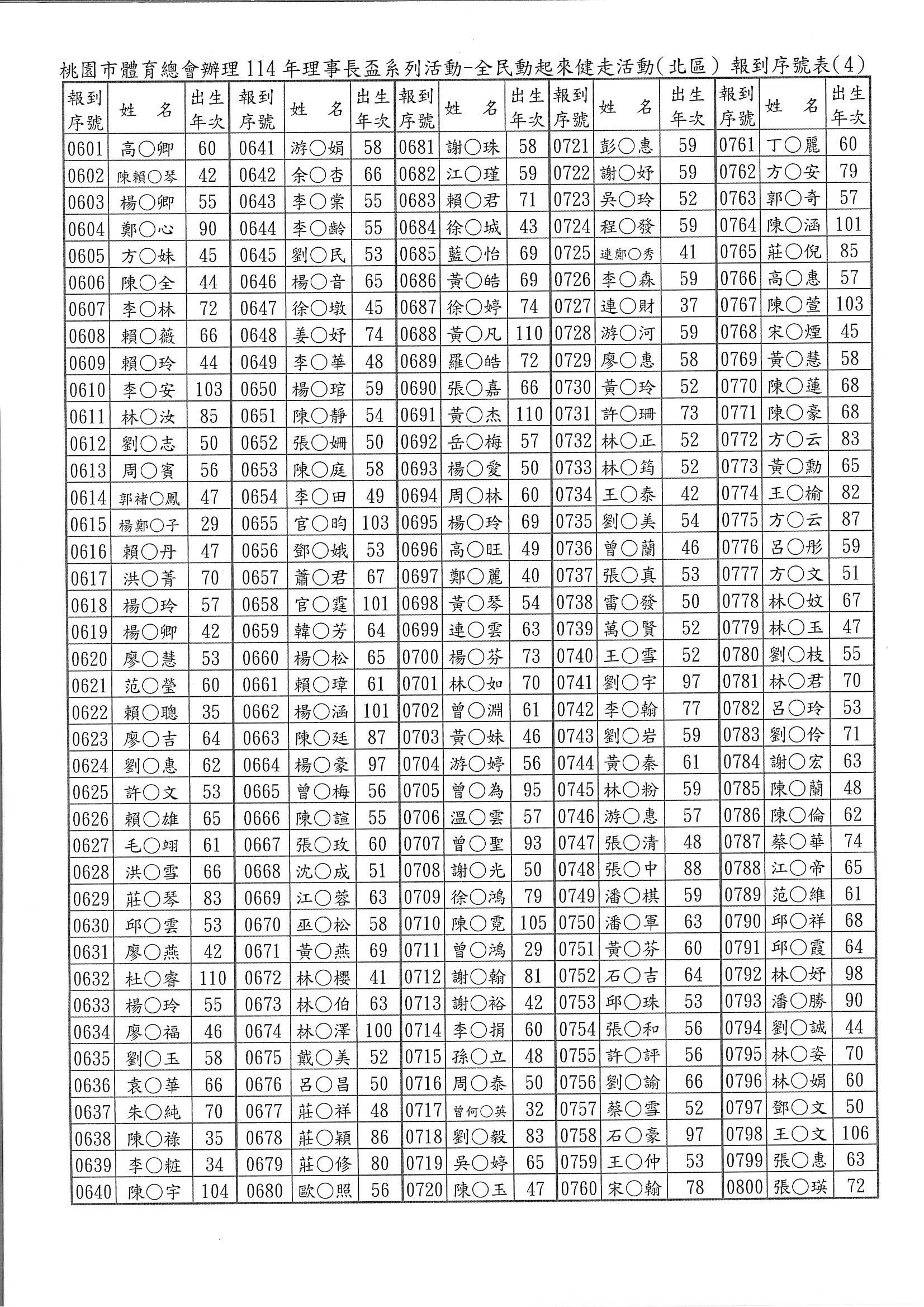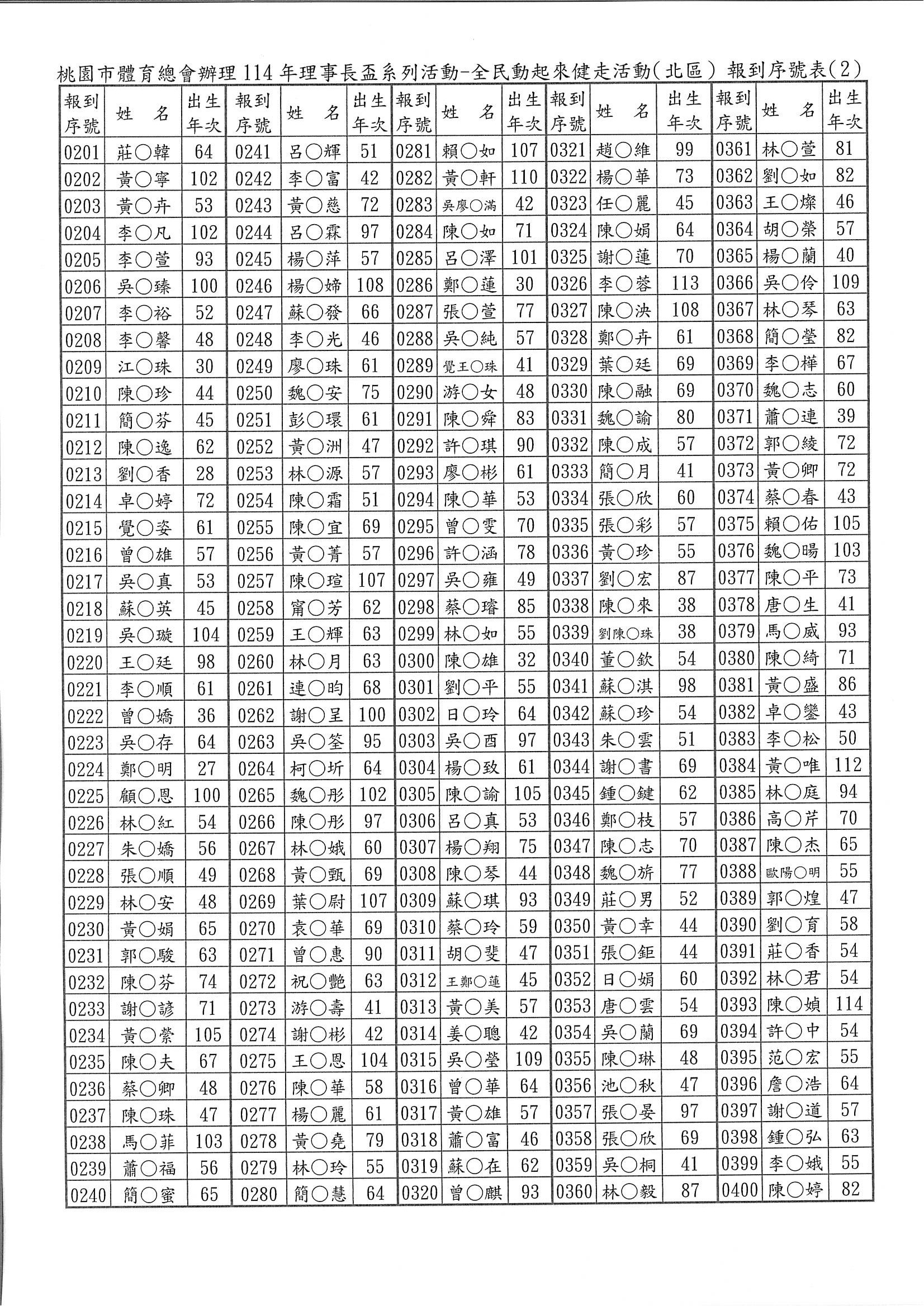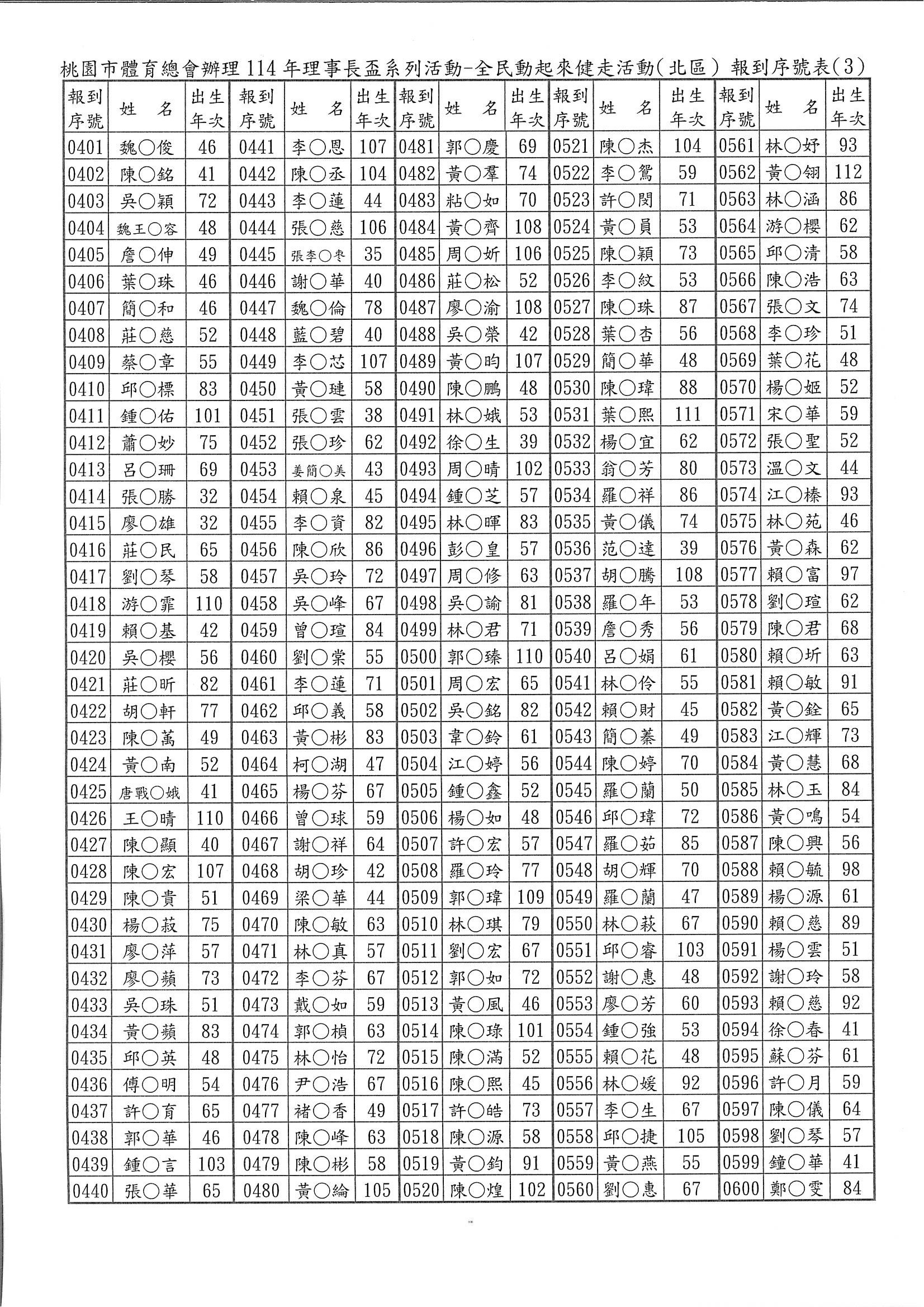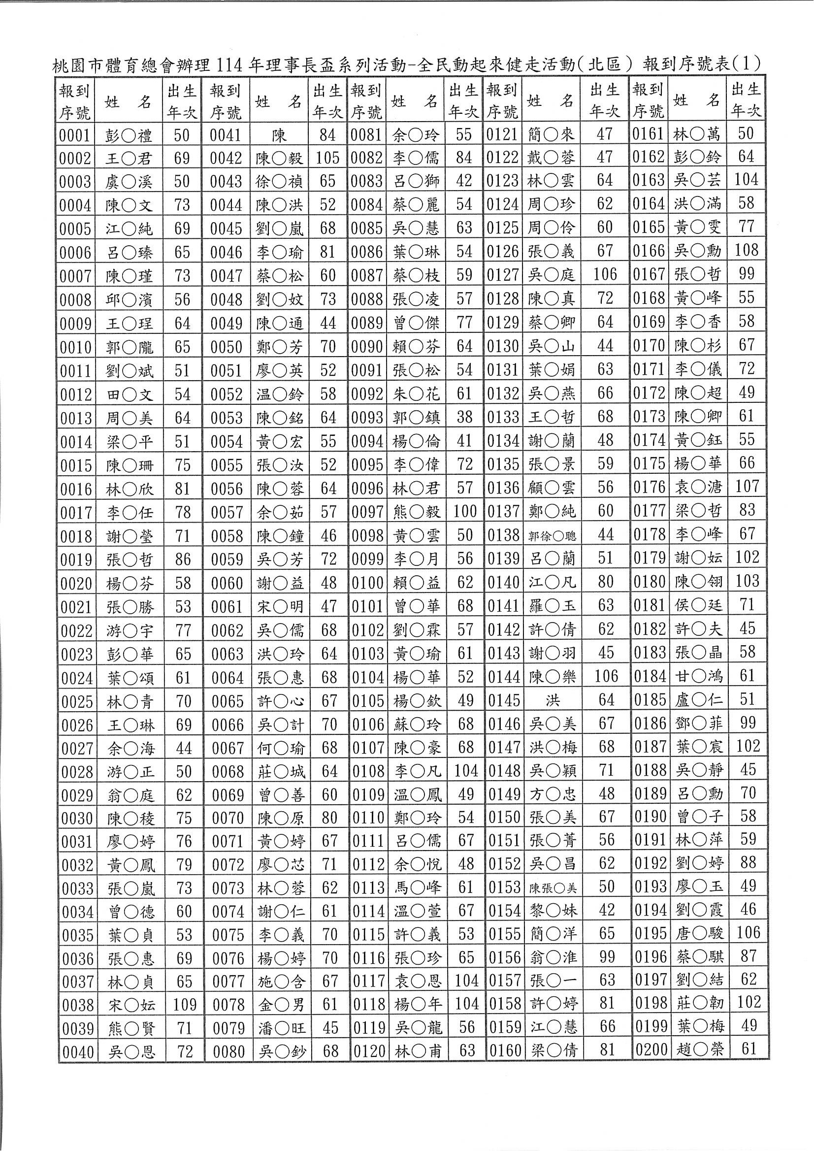 5.本次活動未開放現場報名。完成線上報名者請於活動當日07:40~08:10親自攜帶相關身分證件(例:身分證、健保卡、駕照等之一種有效證明文件備查)至線上報名報到窗口辦理報到。(為簡便報到手續,本會已將報名者依先後順序編定「報到序號」,請參閱附加檔案,並請您記住四位數之「報到序號」,在報到時告訴我們您的「報到序號」。報到序號,並公告於桃園市體育總會官網。