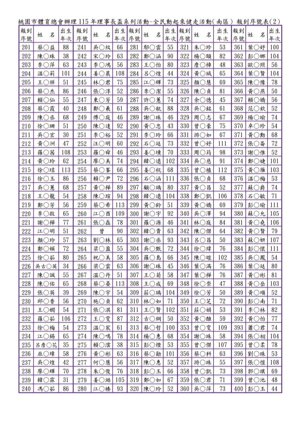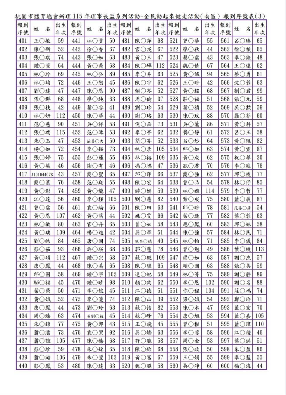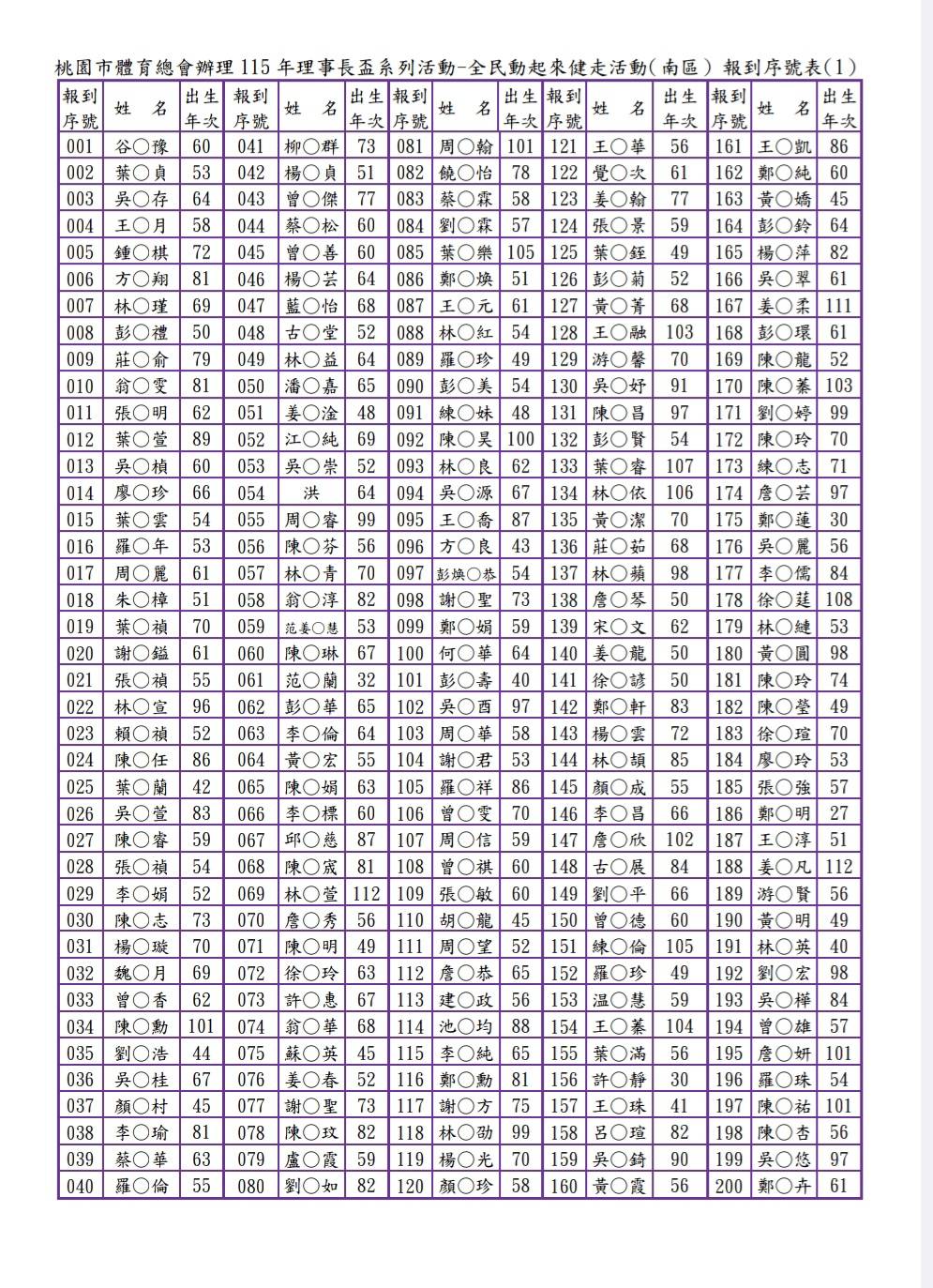 3.完成線上報名者請於活動當日07:50~08:30親自攜帶相關身分證件(例:身分證、健保卡、駕照等之一種有效證明文件備查)至線上報名報到窗口辦理報到。(為簡便快速完成活動當日的報到手續,本會將已報名者依先後順序編定「報到序號」,請參閱附加檔案,並請您記住三位數之「報到序號」,在報到時告訴我們您的「報到序號」。報到序號,並公告於桃園市體育總會官網。